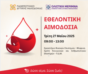 Η Ολιστική Μέριμνα του Πανεπιστημίου Δυτικής Μακεδονίας σε συνεργασία με το Τμήμα Αιμοδοσίας του Γενικού Νοσοκομείου Φλώρινας «Ελένη Δημητρίου», διοργανώνουν εθελοντική αιμοδοσία στη Φλώρινα, την Τρίτη 27 Μαΐου 2025, από τις 09.00 έως τις 13.00, σε ειδικά διαμορφωμένο χώρο στο Εργαστήριο Φυσικών Επιστημών της Σχολής Κοινωνικών και Ανθρωπιστικών Επιστημών Π.Δ.Μ.