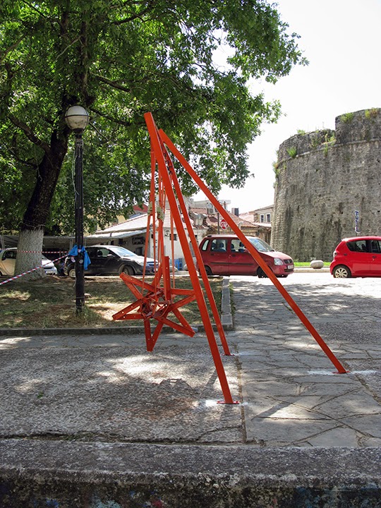 Η βαμμένη, σε έντονο πορτοκαλί βερνικόχρωμα, ανάλαφρη τρίποδη μεταλλική βάση του -φυσικά κινούμενου- αστεροειδούς γλυπτού, δημιούργησε έναν έντονο χρωματικά, μορφολογικά, υφολογικά, διάλογο με το δεσπόζον, σε γήινους τόνους, καμπύλο περίβλημα από βαριά λιθοδομή, του Κάστρου των Ιωαννίνων, που αποτελεί σημείο αφετηρίας της πόλης από το 1815 μέχρι σήμερα, λόγω των τελευταίων επεμβάσεων του Αλή Πασά.