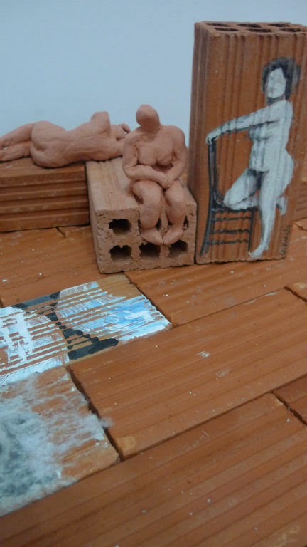 Οι τοίχοι της γκαλερί χάσκουν άδειοι και η επιδαπέδια προσαρμογή των έργων τούβλων μέσω μιας δισδιάστατης και καθαρά ρυθμικής επανάληψης γονιμοποιούν την άρνηση της πλαστικότητας και της ψευδαίσθησης Αλλά η ευρύτατες ασυναρμολογησιές, τα κρόσια, η εμφατικότητα και η πυκνότητα του υποδηλωμένου δαπέδου ως υπόστρωμα ενός μισοτελειωμένου κλισέ τυπογράφου λειτουργεί σαν υποδιαίρεση για την παρούσα συνθήκη ενός Νέου Ερειπίου, Αυτού που ως τούβλο είναι σταθερό και κτισμένο αλλά προτείνεται ως άκτιστο και εμπεδωμένο. Από την στιγμή που η αισθητική που προτείνετε απορρίπτει την κομψότητα των τελειοποιημένων και λειασμένων επιφανειών. Η αδεξιότητα του Χάρη Κοντοσφύρη είναι παράμετρος μιας ενορχηστρωμένης δυσπλασίας: μικρές επιφανείες τούβλων λερώνονται με τσιμέντο γκρι χρώματος με λεπτεπίλεπτο σχέδιο διαφανής αναγλύφικοτητας και μια εκτενής ομάδα 30 και πλέον νέων καλλιτεχνών παρεμβαίνει εικαστικά και αυτή σε τούβλα συνεργώντας για την αφθονία, την πληρότητα και την αυθεντικότητα του πλήθους.